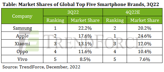 Trend Force ºÃÔÉÑ·ÇÔà¤ÃÒÐËì¢éÍÁÙŪ×èʹѧ ä´éà»Ô´à¼Â¢éÍÁÙÅÊèǹáºè§ã¹µÅÒ´ÊÁÒÃì·â¿¹âÅ¡¢Í§äµÃÁÒÊ 3 »Õ 2022 ÁÕÊÁÒÃì·â¿¹·Ñé§ËÁ´¢ÒÂÍÍ¡ä»ä´é 289 ÅéÒ¹à¤Ã×èͧ Ŵŧ 0.9% àÁ×èÍà·Õº¡ÑºäµÃÁÒÊ·ÕèáÅéÇ áÅÐŴŧ¶Ö§ 11% àÁ×èÍà·Õº¡ÑºäµÃÁÒÊà´ÕÂǡѹ¢Í§»Õ¡è͹ ÊÓËÃѺäµÃÁÒʹÕéáªÁ»ìÂѧ¤§à»ç¹à¨éÒà¡èÒà¨éÒà´ÔÁÍÂèÒ§ Samsung «Ö觤ÃͧÊèǹáºè§µÅÒ´ 22.2% µÒÁÁÒ´éÇ Apple ·Õè¤ÃͧÊèǹáºè§ 17.6% ÍÂèÒ§äáç´Õ Trend Force ·Ó¹ÒÂÇèÒ Apple ¨ÐàµÔºâµÍÂèÒ§ÃÇ´àÃçÇã¹äµÃÁÒÊ 4 â´ÂÍÒ¨¤ÃͧÊèǹáºè§ä´éÁÒ¡¶Ö§ 24.6% ¢Öé¹à»ç¹àºÍÃì˹Öè§á·¹ Samsung