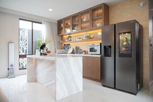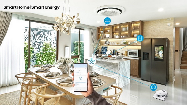ในส่วนห้องนั่งเล่นส่วนกลางของบ้าน ซึ่งสามารถควบคุมด้วยโหมด Keep The Fresh Air เพื่อควบคุม Cube Air Purify เครื่องฟอกอากาศ สุดหรูรุ่นใหม่ล่าสุดจากซัมซุง ตัวช่วยที่จะทำให้อากาศภายในห้องนี้สดชื่นยิ่งขึ้น นอกจากนี้ในส่วนของโหมด Care For Your Pet หรือการดูแลสัตว์เลี้ยงภายในบ้าน ด้วยอุปกรณ์ตัวช่วยสอดส่องสัตว์เลี้ยงได้ทุกที่ทุกเวลา จาก Camera 360 และในส่วนของ Pantry หรือพื้นที่จัดเตรียมอาหาร สามารถใช้โหมด Save your energy ถือได้ว่าเป็น Highlights สำคัญของบ้าน Smart Home Smart Energy เพราะนอกจากแอปพลิเคชั่น SmartThings ที่สามารถควบคุมอุปกรณ์ IOT รวมไปถึงเครื่องใช้ไฟฟ้าจากซัมซุง ที่ช่วยอำนวยความสะดวก เพิ่มความปลอดภัยภายในบ้าน แล้วนั้น ยังสามารถเลือกใช้พลังงานโซล่าร์เซลล์ ให้เป็นพลังงานพลังงานทดแทน เพื่อช่วยลดการใช้พลังงานอย่างยั่งยืนได้อีกด้วย ไม่ว่าจะเป็นการดูค่าไฟฟ้าและการควบคุมพลังงานที่ใช้ไปทั้งหมดได้แบบ Real time ทั้งยังสามารถดูการผลิตพลังงานแสงอาทิตยว่าผลิตได้เท่าไหร่ นำมาใช้งานในช่วงเวลาไหนบ้าง มีการตรวจสอบได้ว่าเครื่องใช้ไฟฟ้าแต่ละชนิดใช้พลังงานไปเท่าไหร่ และมีการประหยัดพลังงานในการใช้งานมากน้อยเพียงใด หรือจะเป็นการเปิดรับแจ้งเตือนหากอุปกรณ์ถูกเปิดทิ้งไว้ หรือมีการใช้พลังงานเกินปกติ เป็นต้น ซึ่งการใช้งานเครื่องใช้ไฟฟ้าซัมซุง ภายในบ้าน Smart Home ด้วยโหมด AI saving mode นั้น จะช่วยประหยัดพลังงานได้อย่างยั่งยืน และช่วยลดค่าไฟ โดยเฉลี่ยได้ถึง 40% เป็นประโยชน์ต่อผู้อยู่อาศัยมากยิ่งขึ้น