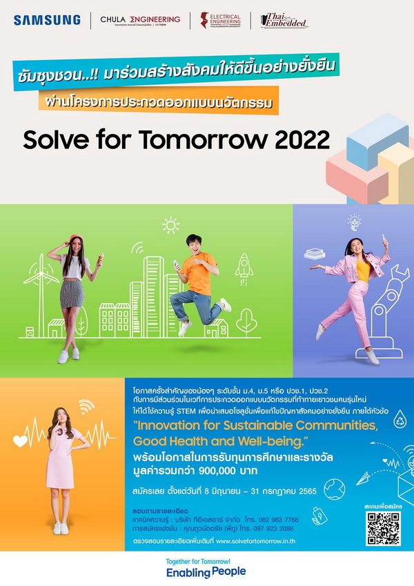 กรุงเทพฯ (8 มิถุนายน 2565) – บริษัท ไทยซัมซุง อิเลคโทรนิคส์ จำกัด จัดโครงการ Samsung Solve for Tomorrow 2022 ชวนเยาวชนที่กำลังศึกษาในระดับชั้นมัธยมปีที่ 4 – 5 และระดับประกาศนียบัตรวิชาชีพ ชั้นปีที่ 1 – 2 ร่วมประกวดออกแบบนวัตกรรม ภายใต้หัวข้อ “Innovation for Sustainable Communities, Good Health and Well-being” โดยประยุกต์ใช้ความคิดสร้างสรรค์และทักษะความรู้ด้านวิทยาศาสตร์ เทคโนโลยี วิศวกรรมศาสตร์และคณิตศาสตร์ (STEM) ในการนำเสนอโซลูชันเพื่อพัฒนาสังคมให้ดีขึ้นอย่างยั่งยืน ซึ่ง 20 ทีมที่ผ่านการคัดเลือกจะได้รับโอกาสเข้าร่วมเวิร์คชอปกับผู้เชี่ยวชาญ พร้อมรับเงินสนับสนุนในการพัฒนาโซลูชันต้นแบบ (Prototype) รวมถึงเงินรางวัลและแท็บเล็ตซัมซุงสำหรับ 3 ทีมผู้ชนะ มูลค่ารวมกว่า 900,000 บาท