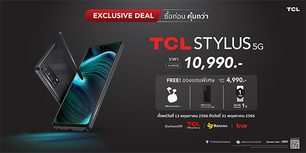 คุ้มยิ่งขึ้น! เมื่อซื้อผ่านผู้ให้บริการเครือข่าย TRUE ที่ร้าน TRUE SHOP ราคาเริ่มต้นเพียง 5,890 บาท และคุ้มอีก 3 ต่อ! กับโปรโมชัน EXCLUSIVE DEAL เมื่อซื้อ TCL STYLUS 5G ตั้งแต่วันที่ 12 พฤษภาคม 2566 ถึง 31 พฤษภาคม 2566 รับฟรี ของสมนาคุณถึง 3 อย่าง รวมมูลค่า 4,990 บาท ประกอบด้วย หูฟังไร้สาย TCL MOVEAUDIO Air มูลค่า 1,490 บาท, เคสมือถือ TCL STYLUS 5G Card Holder Case มูลค่า 450 บาท และประกันหน้าจอแตกนาน 1 ปี จำนวน 1 ครั้ง มูลค่า 3,050 บาท รีบเลย! ของแถมมีจำนวนจำกัด