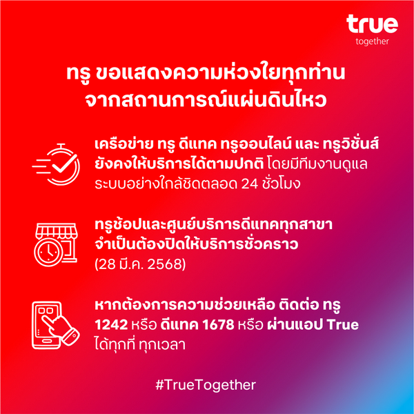 อย่างไรก็ตาม ศูนย์บริการทรูและดีแทคช้อปจะงดให้บริการชั่วคราว เพื่อดำเนินการตรวจสอบความปลอดภัยของสถานที่อย่างละเอียด โดยทรูให้ความสำคัญสูงสุดต่อความปลอดภัยของทั้งลูกค้าและพนักงาน โดยจะเปิดให้บริการอีกครั้งในวันพรุ่งนี้ (29 มีนาคม 2568) สำหรับศูนย์บริการฯที่อยู่ภายในศูนย์การค้า จะเปิดให้บริการตามนโยบายการเปิดให้บริการของศูนย์การค้า ทั้งนี้ ลูกค้าสามารถใช้บริการหลังการขายผ่านแอปพลิเคชันของทรู หรือคอลเซ็นเตอร์ ทรู 1242 และ ดีแทค 1678 ได้ตามปกติ