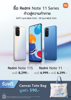 Redmi Note 11 Pro 5G 1และ Redmi Note 11 Pro จะวางจำหน่ายในประเทศไทยเร็วๆ นี้ สำหรับ Redmi Note 11S และ Redmi Note 11 วางจำหน่ายในประเทศไทยอย่างเป็นทางการในวันที่ 5 กุมภาพันธ์ 2565 ณ Xiaomi Store ทุกสาขาและร้านค้าที่ร่วมรายการทั่วประเทศ รวมถึงช่องทางร้านค้าออนไลน์ทุกแพลตฟอร์ม พิเศษ สำหรับผู้ที่ซื้อในวันที่ 5 - 28 กุมภาพันธ์ 2565 รับทันที Xiaomi Canvas Tote Bag มูลค่า 590 บาท