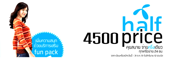 ตอนนี้คุณอยู่ที่ >> หน้าแรก >> Catalog โปรโมชั่นมือถือ >> หน้ารายละเอียด โปรโมชั่น Half Price 4500 คุยสบายจ่ายครึ่งเดียว ( DTAC : ดีแทค )