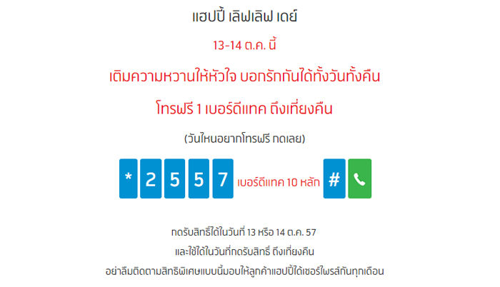 ตอนนี้คุณอยู่ที่ >> หน้าแรก >> Catalog โปรโมชั่นมือถือ >> หน้ารายละเอียด โปรโมชั่น Happy Free Day Love Love ( DTAC : ดีแทค )