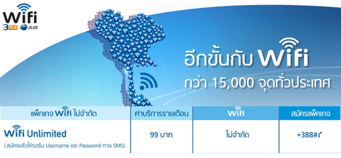 Wifi กว่า 15,000 จุดทั่วประเทศ เล่นเน็ตได้ไม่จำกัด ด้วยความเร็วสูงสุดถึง 4 Mbps. ด้วยการร่วมมือของ AIS และ 3BB เพื่อให้บริการ Wifi ครอบคลุมพื้นที่ทั่วประเทศ (แหล่งช็อปปิ้ง, ร้านอาหาร, โรงภาพยนตร์, โรงพยาบาล และแหล่งชุมชน)