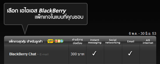 แพ็กเกจ BlackBerry Unlimited ใช้งาน BlackBerry Messenger, Instant Messaging, Push mail และ Social Networking (Facebook, Twitter) เล่น Internet