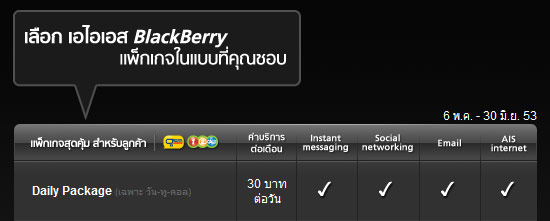 แพ็กเกจ BlackBerry Unlimited ใช้งาน BlackBerry Messenger, Instant Messaging, Push mail และ Social Networking (Facebook, Twitter) เล่น Internet