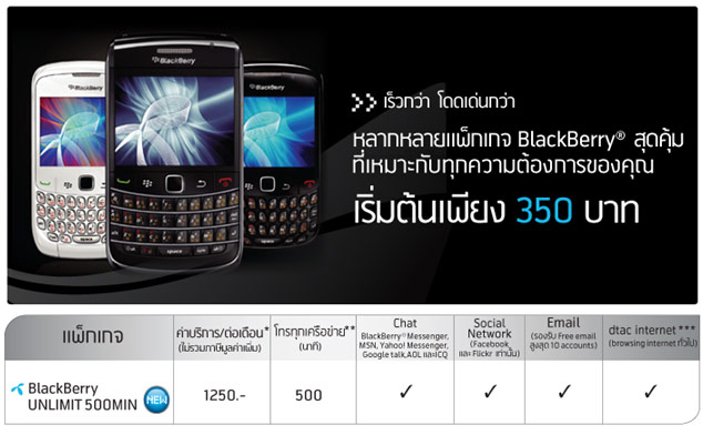 สำหรับซิมจดทะเบียนเพื่อใช้บริการ BlackBerry เหมาจ่ายขั้นต่ำ 1,250 บาท/รอบบิล (ไม่รวมภาษีมูลค่าเพิ่ม) รับสิทธินาน 12 รอบบิล นับตั้งแต่วันที่สมัคร