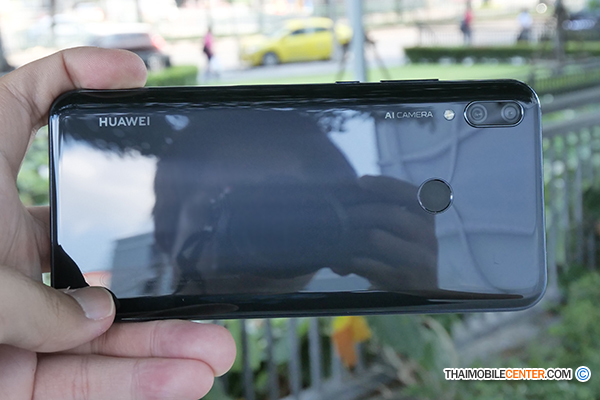 ตัวเครื่องด้านหลังของ Huawei Y9 2019 เป็นโลหะเคลือบกระจกที่มีความเงาเป็นพิเศษ กล้องดิจิทัลด้านหลังเป็นกล้องคู่แบบแนวตั้งความละเอียด 13+2 ล้านพิกเซล มาพร้อมกับระบบประมวลผลภาพด้วย AI ที่ช่วยปรับแต่งภาพถ่ายให้สวยงามโดยอัตโนมัติ อย่างไรก็ดี ฝาหลังที่เป็นกระจกอาจเกิดรอยขีดข่วนและรอยนิ้วมือได้ง่าย จึงควรใช้งานอย่างระมัดระวัง หรือจะใส่เคสซิลิโคนแบบใสที่แถมมาให้ในกล่องก็ได้ครับ