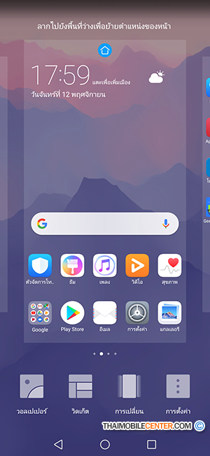 เมื่อรวบนิ้วชี้และนิ้วโป้งเข้าหากันในมุมทแยง หรือกดค้างบนพื้นที่ว่างบนหน้าจอหลัก จะเข้าสู่การปรับแต่งหน้าจอ ซึ่งเราสามารถเปลี่ยนวอลเปเปอร์, เพิ่ม-ลบวิดเจ็ต และเลือกรูปแบบอนิเมชันการเปลี่ยนหน้าของ App Drawer ได้
