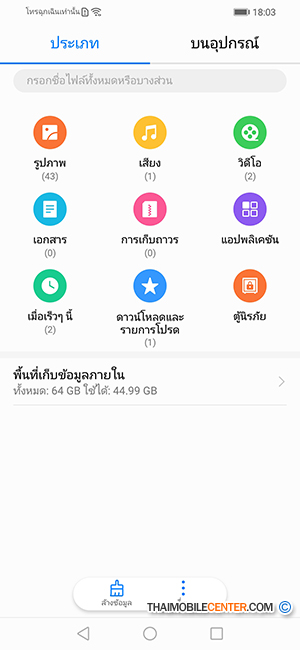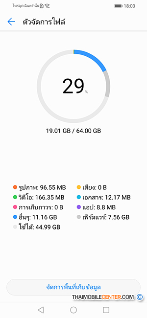 Huawei Y9 2019 มีแอปพลิเคชันสำหรับจัดการไฟล์ต่างๆ ในเครื่อง ซึ่งแบ่งเป็นหมวดหมู่ให้เข้าถึงได้ง่าย และมีการแสดงสัดส่วนการใช้งานของหน่วยความจำภายใน ว่าไฟล์ประเภทไหนกินพื้นที่ไปเท่าไหร่บ้าง