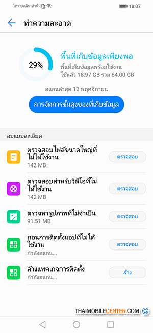 Huawei Y9 2019 ยังมีแอปพลิเคชัน ตัวจัดการโทรศัพท์ สำหรับทำความสะอาดไฟล์ขยะ, เคลียร์หน่วยความจำ และปิดการทำงานของแอปพลิเคชันพื้นหลังให้ในคลิกเดียว นอกจากนี้ยังเปิดโอกาสให้เราจัดการการใช้แบตเตอรี่, การส่งข้อมูลมือถือ และการโทรอีกด้วย