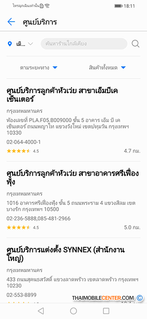 นอกจากนี้ เรายังสามารถค้นหาศูนย์บริการ Huawei ผ่านแอปพลิเคชันนี้ได้ด้วย โดยระบบจะแสดงศูนย์บริการที่ใกล้ที่สุดขึ้นมาก่อนโดยอัตโนมัติพร้อมระยะทางและเบอร์ติดต่อ ซึ่งมีประโยชน์มากๆ ครับ