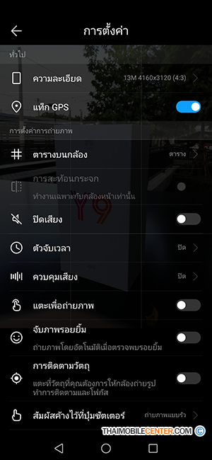 เมื่อกดที่ไอคอนรูปฟันเพืองที่แถบเมนูด้านบน จะเข้าสู่การตั้งค่ากล้อง ในส่วนของการตั้งค่ากล้องหลัง สามารถปรับความละเอียดภาพได้ 3 ขนาด ได้แก่ 13 ล้านพิกเซลในอัตราส่วน 4:3, 10 ล้านพิกเซลในอัตราส่วน 1:1 และ 8 ล้านพิกเซลในอัตราส่วน 18.7:9