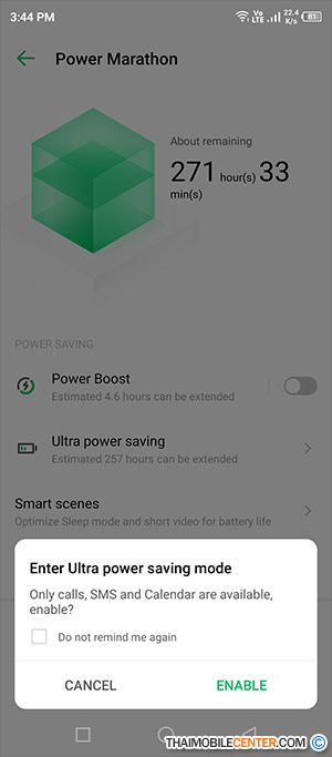 พร้อมโหมดประหยัดพลังงานแบบขั้นสุดอย่าง Ultra power saving ที่ช่วยยืดเวลาการใช้งานให้ยาวนานกว่าเดิมหลายเท่าตัว แต่แลกมากับการใช้งานได้เพียงฟังก์ชันการโทร, ส่ง SMS และปฏิทินเท่านั้น