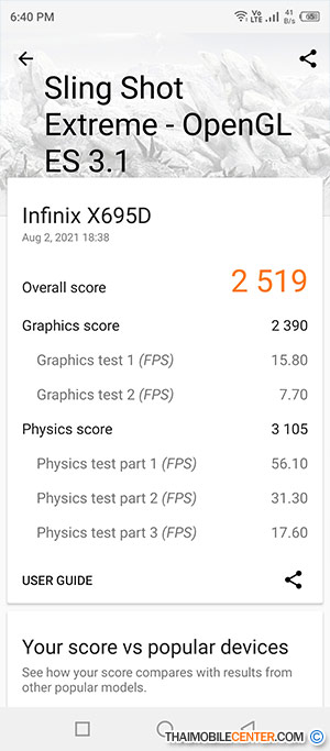 สำหรับผลทดสอบการประมวลผลด้านกราฟิกจากแอปพลิเค ชัน 3DMark แบบ OpenGL ES 3.1 อยู่ที่ 2,519 คะแนน