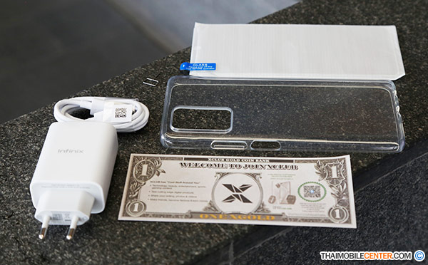 ภายในกล่องมีอุปกรณ์พื้นฐานมาให้อย่างครบครัน ไม่ว่าจะเป็น อะแดปเตอร์ชาร์จเร็ว 33W (10V/3.3A), สายเชื่อมต่อแบบ USB Type-C, เคสใส, เข็มสำหรับถอดถาดซิมการ์ด, ฟิล์มกันรอย และบัตร XClub Gold Coin Bank