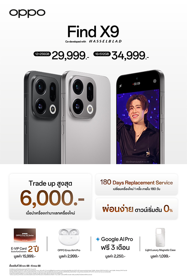 - OPPO Find X9 รุ่น RAM 12GB+ROM 256GB ราคา 29,999 บาท