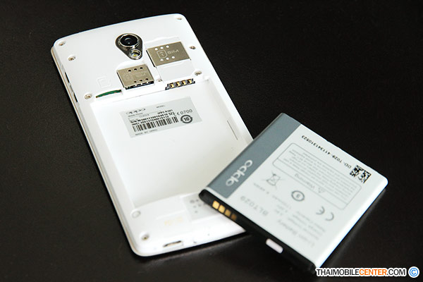 เมื่อถอดฝาหลังออก สังเกตด้านบนจะพบกับช่องสำหรับใส่ซิมการ์ด แบบ miniSIM และ microSIM รวม 2 ช่องด้วยกัน ส่วนแบตเตอรี่ที่ให้มานั้น จะเป็นแบตเตอรี่ Li-ion ขนาดความจุ 1700 mAh ซึ่งตัวของแบตเตอรี่จะมีขนาดเล็ก และบางเป็นพิเศษ