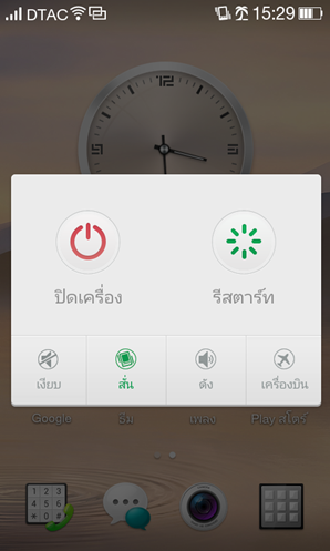 ในส่วนของการ เปิด-ปิด เครื่องนั้น จะมีคำสั่งปิดเครื่อง และคำสั่งรีสตาร์ท ในส่วนด้านบน และในส่วนด้านล่างนั้นจะมี โหมดปิดเสียง, โหมดเปิดระบบสั่น, โหมดเปิดเสียง และโหมดใช้งานบนเครื่องบิน
