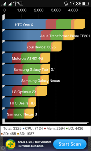 เมื่อทดสอบประสิทธิภาพการใช้งานด้วยโปรแกรม AndEBench ผลคะแนนด้าน Native จะออกมาอยู่ที่ 3420 คะแนน และผลคะแนนด้าน Java จะออกมาอยู่ที่ 180 คะแนน