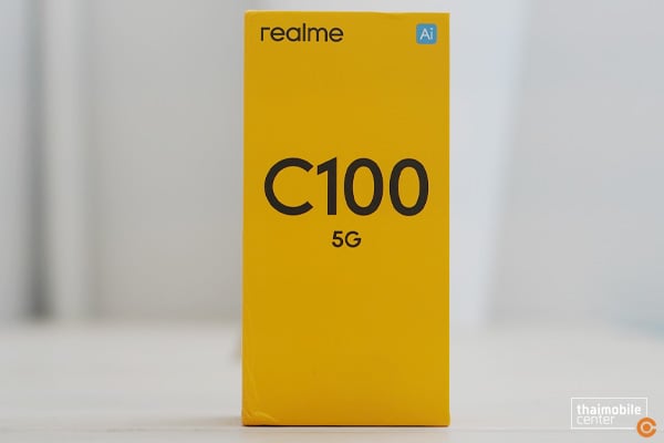 สำหรับแพ็กเกจของ realme C100 5G เป็นกล่องสีเหลืองซึ่งเป็นเอกลักษณ์ของแบรนด์ realme ด้านหน้าระบุชื่อรุ่น พร้อมไอคอน AI ที่มุมบนขวา โดยอุปกรณ์ภายในกล่องที่วางจำหน่ายจริงจะประกอบด้วย