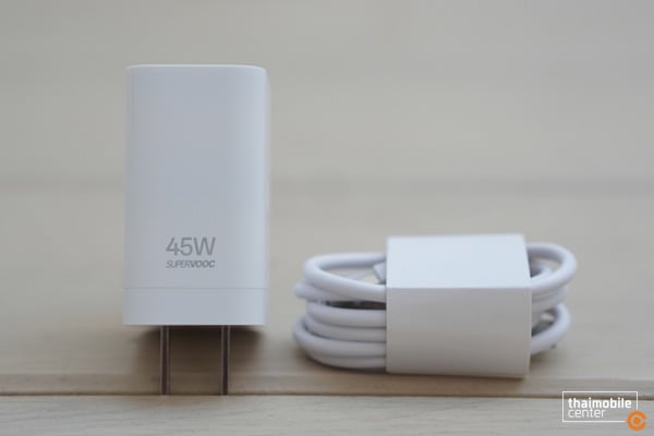 - อะแดปเตอร์สำหรับชาร์จแบตเตอรี่แบบ 15W (หากต้องการใช้งานอะแดปเตอร์ 45W SUPERVOOC แบบในรีวิวนี้ต้องซื้อเพิ่มเติมในภายหลัง)
