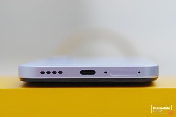 ด้านล่างของตัวเครื่อง ประกอบด้วย ลำโพงเสียง, พอร์ต USB-C, ไมโครโฟนตัวหลัก และถาดใส่ซิมการ์ดซึ่งรองรับการใส่ซิมแบบ Dual Nano SIM