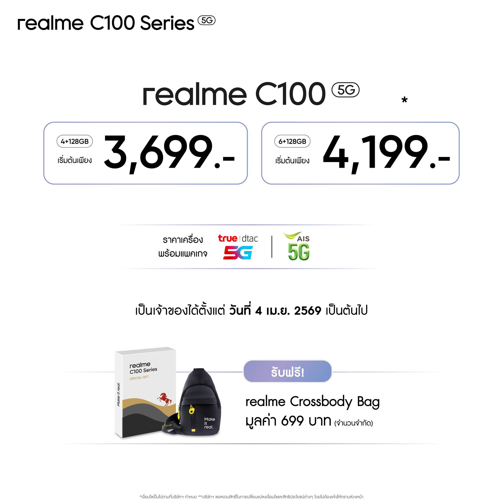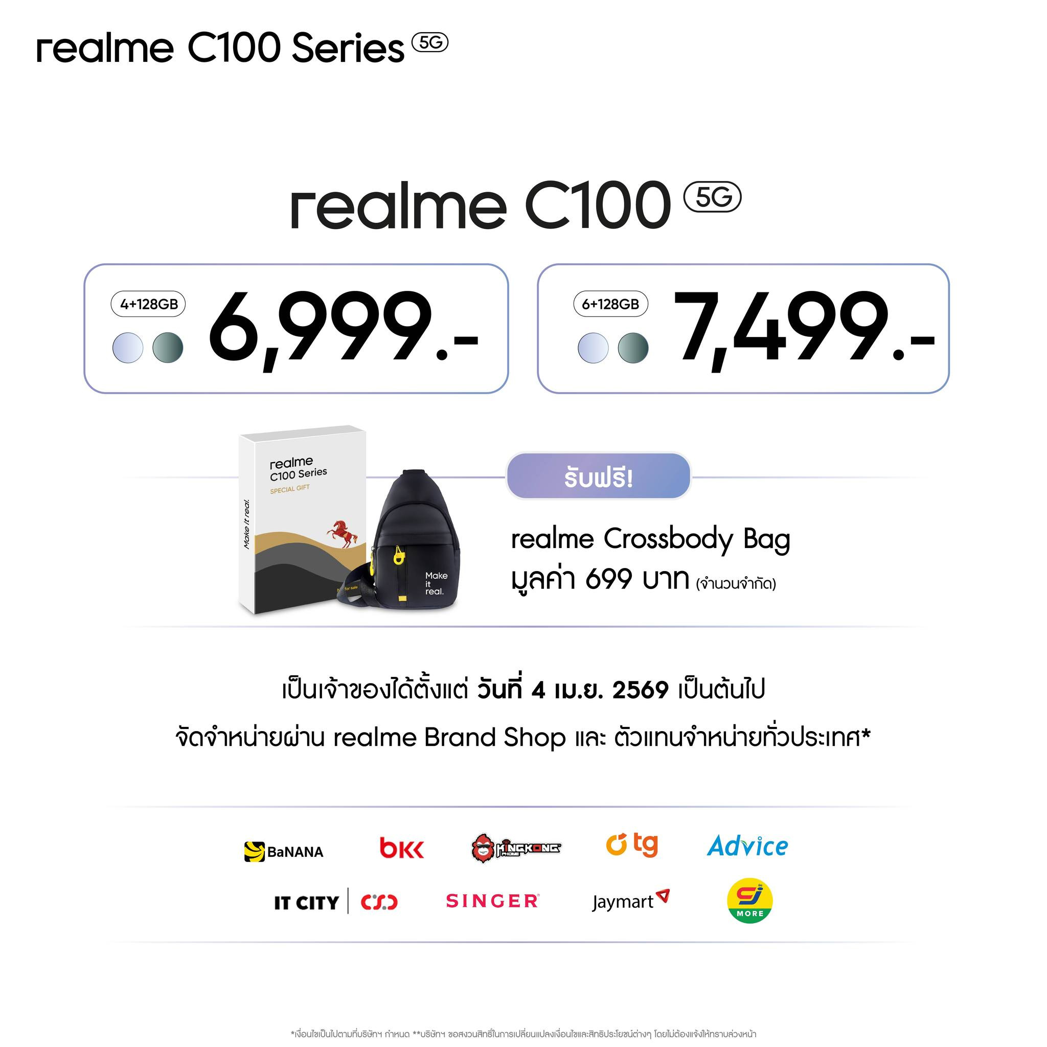 realme C100 5G จะเริ่มวางจำหน่ายอย่างเป็นทางการในประเทศไทยตั้งแต่วันที่ 4 เมษายน 2569 เป็นต้นไป โดยมีให้เลือก 2 รุ่น 2 ราคาดังนี้