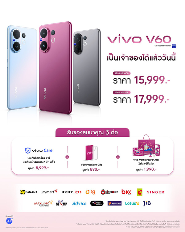 และสำหรับผู้ที่ซื้อภายในวันที่ 30 กันยายน 2568 รับฟรี ประกันตัวเครื่อง 2 ปี ประกันหน้าจอแตก 2 ปี 1 ครั้ง มูลค่า 8,999 บาท และ V60 Premium Gift มูลค่า 890 บาท โดยสามารถจับจองเป็นเจ้าของได้แล้ววันนี้ที่ BaNANA, Jaymart, IT City | CSC, TG, KINGKONG, BKK, Big C, SINGER, Maxlink, STAMP, Advice, Power Mall, Power Buy, Lotus และ JIB ทุกสาขาทั่วประเทศ