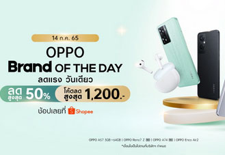 OPPO มอบโปรโมชันเด็ดกลางเดือนเอาใจสาย Gadget ผ่านแคมเปญ “OPPO Brand Of The Day” มอบส่วนลดสมาร์ตโฟนและอุปกรณ์ IoT สูงสุด 50% พร้อมโค้ดลดสูงสุด ถึง 1,200 บาท พลาดไม่ได้! เฉพาะวันที่
