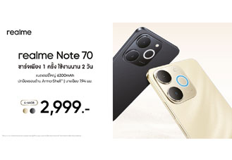 realme เปิดตัว realme Note 70 สมาร์ตโฟนสายประหยัด แบตใหญ่ 6,300mAh ใช้งาน 2 วันเต็ม ชาร์จไว 15W กันน้ำ IP54 จอ HD+ 90Hz ชิป T7250 RAM สูงสุด 12GB กล้อง 13MP ในราคาเพียง 2,999 บาท