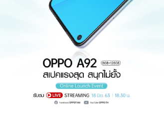 หลังจากที่ทาง Official Facebook ของ OPPO ได้โพสข้อความพร้อมรูปภาพงาน “OPPO A92 สเปคแรงสุดสนุกไม่ยั้ง Online Launch Event” จึงเป็นที่ยืนยันแล้วว่า OPPO A92 จะเปิดตัวพร้อมวางจำหน่าย