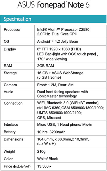 10.3 มิลลิเมตร และมีน้ำหนักตัวอยู่ที่ 210 กรัม โดยเครื่อง Asus Fonepad Note 6 ที่นำเข้ามาจำหน่าย