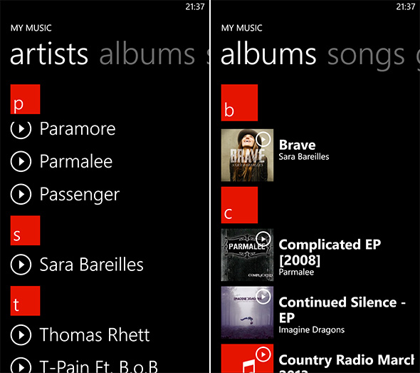 ในยุคนี้ หลายท่านอาจชื่นชอบการฟังเพลงผ่าน สมาร์ทโฟน กันมากขึ้น ซึ่งหากเป็นสมาร์ทโฟนทั่วไปนั้น อาจทำได้เพียงแค่ Sync ไฟล์เพลง ลงไปยังสมาร์ทโฟนเพื่อฟังตามปกติ แต่สำหรับผู้ใช้ Nokia Lumia 1520 นั้น จะมีความพิเศษกว่า เนื่องจากแอพพลิเคชั่น Nokia Music นั้นได้มีการรวบรวมเอาเพลงดังจากทั่วทุกมุมโลก ซึ่งแน่นอนว่า มีเพลงไทย อยู่ในนั้นด้วย ซึ่งคุณจะสามารถเลือกดาวน์โหลดได้ตามต้องการ นอกจากนี้ Nokia Music บน Nokia Lumia 1520 ยังมีฟีเจอร์เด็ดๆ อีกมากมาย เช่น Mix Radio ที่จะช่วยให้คุณท่องไปยังโลกแห่งเสียงเพลง ตามแนวเพลง หรือ ศิลปินที่ต้องการ หรือจะเป็นฟีเจอร์ Offline Mix ที่จะดาวน์โหลดกลุ่มเพลงโปรดไว้ฟังแบบ Offline ได้ด้วย ดังนั้นเราลองมาดูกันว่า Nokia Music นั้นจะให้ประสบการณ์ การฟังเพลงที่ดีกว่า สำหรับคอเพลงอย่างคุณ ได้อย่างไรบ้าง จัดเรียง อัลบั้ม, ศิลปิน และชื่อเพลง ตามตัวอักษร ง่ายต่อการเลือกฟัง