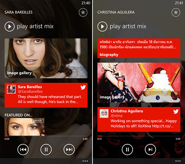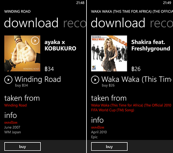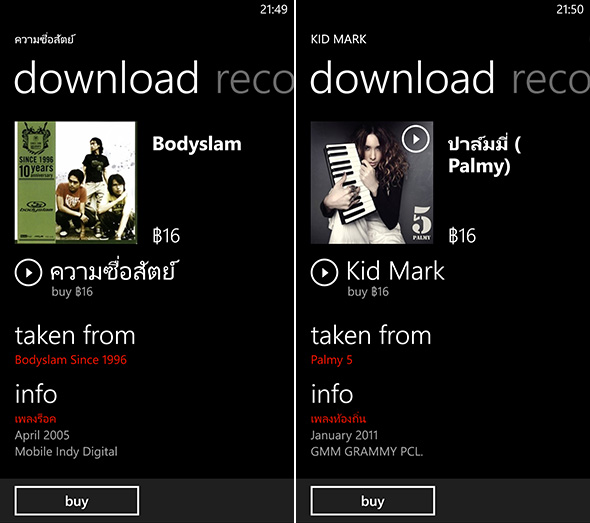 ในขณะที่คุณกำลังเพลิดเพลินไปกับ Mix Radio นั้น ระบบจะมีการแสดงหน้าปก พร้อมรายชื่อเพลงให้ได้ดู ซึ่งถ้าคุณเจอเพลงที่ใช่ คุณสามารถ สัมผัสไปยังหน้าปก เพื่อดูรายละเอียดเพิ่มเติม รวมถึงสามารถกดซื้อ เพื่อเก็บไว้ฟังได้ทันที Nokia Music รองรับภาษาไทย มีเพลงไทยให้ดาวน์โหลด