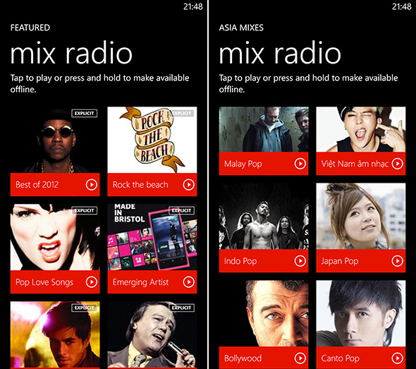 สำหรับ Mix Radio นั้นเปรียบเสมือนเป็นสถานีเพลง ที่มีการแบ่งประเภทของเพลงออกมาอย่างชัดเจน เช่น เพลงในประเทศ, เพลงแถบเอเชีย, เพลงป๊อป, เพลงร็อค และ อื่นๆ ซึ่งคุณสามารถค้นหาเพลงใหม่ๆ จากทั่วทุกมุมโลกโลกได้อย่างง่ายดาย ไม่จำกัดแค่ อินเตอร์, เกาหลี หรือญี่ปุ่นเท่านั้น คุณสามารถหาฟังเพลงจากศิลปินประเทศ อินเดีย, มาเลเซีย, เวียดนาม และอื่นๆ ได้ด้วย เรียกได้ว่า Nokia Music นั้น จะเปิดโลกแห่งการฟังเพลงของคุณให้กว้างยิ่งขึ้นกว่าเดิมอย่างแน่นอน เจอเพลงถูกใจ กดดูข้อมูล พร้อมซื้อได้ทันที