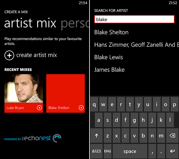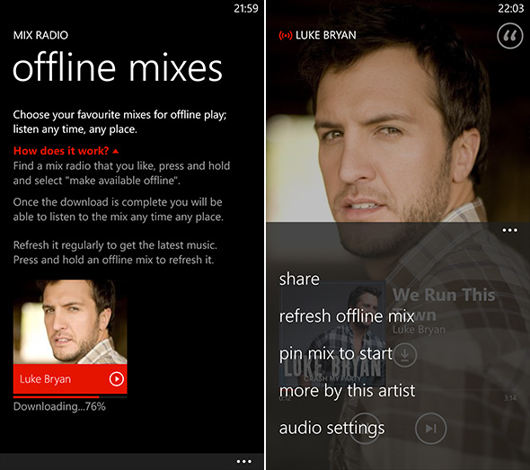 คุณยังคงสามารถสร้างกลุ่มเพลงที่คุณชื่นชอบได้โดยการ เพิ่มชื่อศิลปินที่ชอบลงไป ในเมนู Create a Mix โดยหลังจากระบุรายชื่อศิลปินลงไปเรียบร้อยแล้ว ระบบจะทำการสุ่มเพลงที่เกี่ยวข้องกับ ศิลปินที่คุณได้ทำการเลือกเอาไว้ และเช่นเดียวกัน เมื่อคุณค้นพบเพลงที่ถูกใจ ก็สามารถสัมผัสไปยังหน้าปก เพื่อดูข้อมูล และ ซื้อเก็บไว้ได้ทันที ซึ่งเพลงที่อยู่ในนี้ จะไม่ใช่เพลงภายในเครื่องของคุณ แต่จะเป็นเพลงทั้งหมดที่มีอยู่บน Nokia Music Offline Mixes โหลดเก็บไว้ฟังได้ ไม่ต้องต่อเน็ต