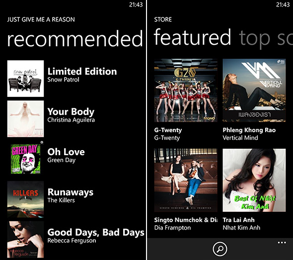 บน Nokia Music นั้นคุณสามารถเลือกซื้อเพลงที่ต้องการใน Store ได้ง่ายขึ้น เพราะมีการแยกหมวดหมู่ของเพลงไว้อย่างชัดเจน หรือจะเลือกดูเพลงจากรายการยอดนิยมในขณะนั้นได้ด้วยเช่นเดียวกัน และแน่นอนว่า คุณสามารถหาซื้อเพลงไทยในนี้ได้ด้วย