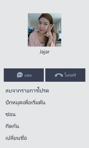 นอกจากนี้ เมื่อกดไปที่รายชื่อก็จะพบกับฟังก์ชันเพิ่มเติม ได้แก่ แชท, โทรฟรี, เพิ่มลงในรายการโปรด, ปักหมุดเพื่อเริ่มต้น, ซ่อน, กีดกัน และเปลี่ยนชื่อ