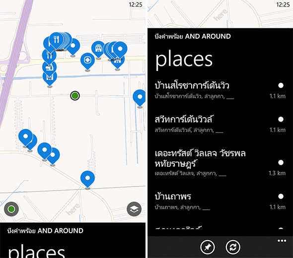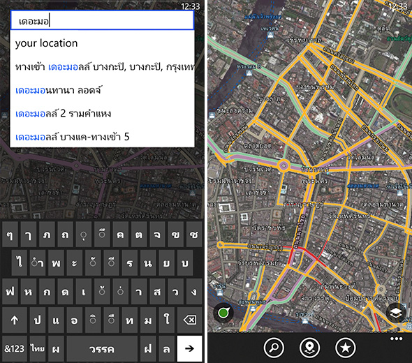 HERE Maps บน Nokia 1320 นั้นรองรับการใช้งาน ค้นหาสถานที่ต่างๆ ด้วยภาษาไทยได้ ซึ่งจะมีการค้นหาสถานที่ ที่มีคำใกล้เคียงกับคำค้นหาให้เลือกด้วยเช่นเดียวกัน และเมื่อคุณเจอสถานที่ ที่ต้องการแล้ว คุณก็สามารถตั้งค่าให้ HERE Maps นำทางคุณไปยังสถานที่ดังกล่าวได้ในทันที ระบบการนำทางแบบ Turn-by-Turn