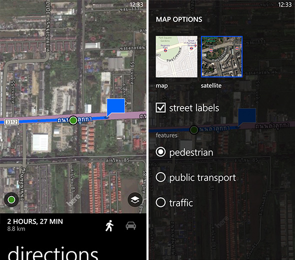 นอกเหนือจากการแสดงผลแผนที่แบบปกติแล้ว ยังสามารถเลือกดูแผนที่แบบภาพถ่ายดาวเทียม (Satellite) และแบบ LiveSight ได้ด้วย ยิ่งไปกว่านั้น คุณยังสามารถให้แอพพลิเคชั่นนี้ แสดงสภาพการจราจรในเส้นทางต่างๆ ได้อีกด้วย รองรับการค้นหาสถานที่ ด้วยภาษาไทย