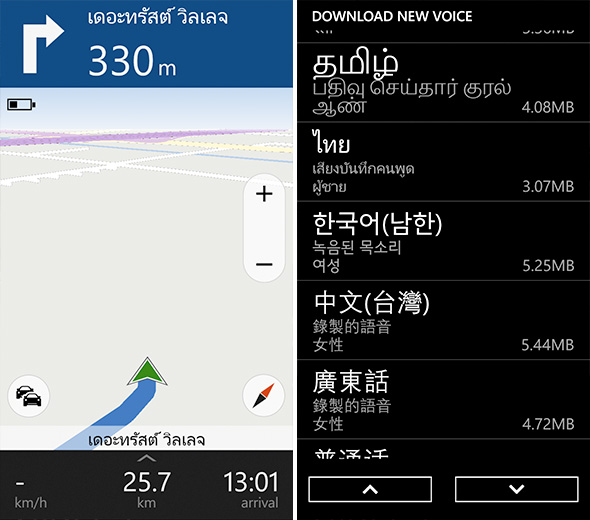 HERE Maps with LiveSight บน Nokia 1320 นั้นสามารถใช้งานฟีเจอร์ การนำทางด้วยเสียง ได้ โดยมีภาษาให้เลือกใช้งานมากมาย รวมถึงภาษาไทยด้วย โดยคุณสามารถโหลดเสียงในภาษาต่างๆ เพิ่มเติมได้ในภายหลัง รองรับการใช้งานแผนที่แบบ Offline นำทางได้แม้ไม่มีอินเทอร์เน็ต