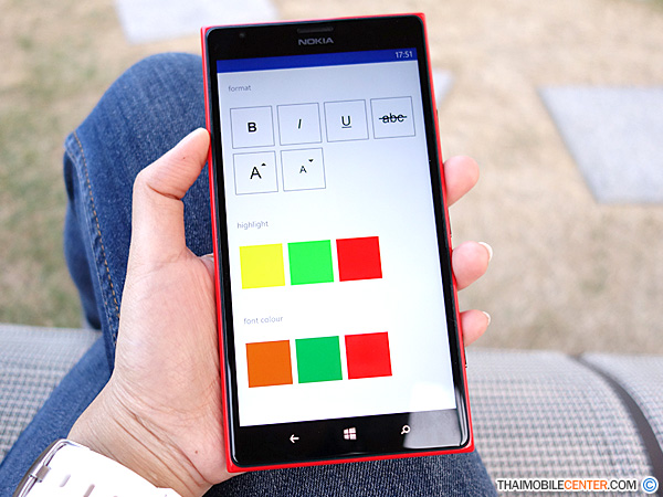นอกจากนี้ ยังสามารถเปลี่ยนรูปแบบของตัวอักษรได้ ไม่ว่าจะเป็น ตัวหนา, ตัวเอียง, ขีดเส้นใต้, ขีดคั่นกลาง หรือจะเพิ่ม-ลดขนาดของตัวอักษร ก็ทำได้เช่นกัน ไม่เพียงเท่านั้น ยังสามารถปรับสีตัวอักษร หรือ ไฮไลท์คำที่ต้องการเน้นได้อีกด้วย ถึงแม้ว่า รูปแบบของตัวอักษร จะมีให้เลือกไม่มาก เท่ากับการใช้งานบนเครื่องเดสก์ท็อป แต่ก็ถือว่า เพียงพอต่อการใช้งานบนอุปกรณ์พกพา อย่าง Nokia Lumia 1520