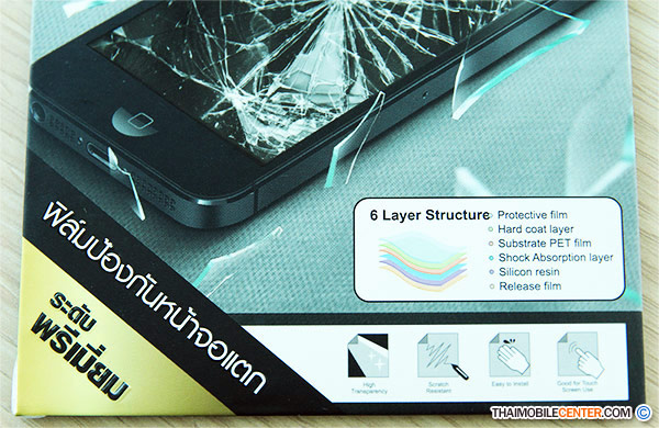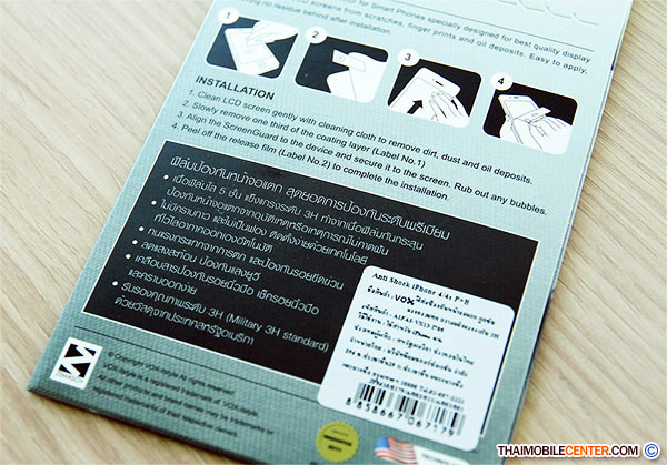 ส่วนด้านล่างนั้นจะเขียนรายละเอียดถึงคุณสมบัติต่างๆ ซึ่ง Vox Anti Shock Film จะประกอบไปด้วยเนื้อฟิล์มใส 6 ชั้น ได้แก่ Protective Film, Hard Coat Layer, Substrate PET Film, Shock Absorption Layer, Silicon Resin และ Release Film รวมไปถึงลดแสงสะท้อน และเคลือบสารป้องกันรอยนิ้วมือ