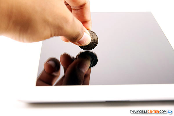 ส่วนการทดสอบด้วยเหรียญ 5 บาท ด้วยการนำมาขีดข่วนบนหน้าจอ ก็จะสังเกตเห็นได้เช่นกันว่าไม่มีรอยเกิดขึ้นเลย