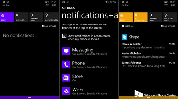 Notification Center มาแล้ว! ความอึดอัดใจอย่างใหญ่หลวงของบรรดาสาวก Windows Phone ในช่วงเวลาที่ผ่านมาคือ ไม่มีศูนย์รวมการแจ้งเตือนเหมือนอย่างที่ iOS และ Android เขามีกัน ทำให้เจ้าของ Windows Phone อาจพลาดการอัพเดททางโซเชียลเน็ตเวิร์กไปอย่างน่าเสียดาย ซึ่งเหตุการณ์นี้จะไม่เกิดขึ้นอีกแล้วเมื่ออัพเดทเป็น Windows Phone 8.1 เพราะมันมาพร้อมกับ Notification Center (ที่จริงทางไมโครซอฟต์ตั้งชื่อให้ระบบนี้ว่า Action Center) ที่รวมการแจ้งเตือนทุกอย่าง อาทิ อีเมลขาเข้า, โซเชียลมีเดียอัพเดท และการแจ้งเตือนกำหนดนัดหมายต่างๆ ไว้ในหน้าจอเดียว รวมถึงมีปุ่มเปิด-ปิดสัญญาณ WiFi, Bluetooth และ Airplane Mode รวมอยู่ด้วย จะว่าไปแล้วก็มีความคล้ายกับ Notification Center ของแอนดรอยด์ไม่น้อยทีเดียว โดยอีกหนึ่งความเปลี่ยนแปลงที่สำคัญคือ People Hub ไม่สามารถเชื่อมต่อกับเฟสบุ๊คได้อีกต่อไป ต้องเปลี่ยนมาใช้งานผ่านแอพพลิเคชั่นเฟสบุ๊คแทน และการแจ้งเตือนจะแสดงผ่าน Notification Center