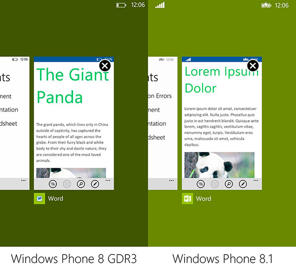 ระบบ Multitasking ที่ปรับปรุงใหม่ หน้าจอ Multitasking (เข้าถึงได้โดยการกดปุ่ม Back ค้างไว้) ที่มีการใส่เพิ่มเติมเข้ามาในเวอร์ชัน Windows Phone 8 GDR3 ได้ถูกอัพเกรดให้ดีขึ้นใน Windows Phone 8.1 โดยผู้ใช้สามารถปิดการทำงานของแอพพลิเคชั่นได้โดยการปาดนิ้วลากหน้าต่างแอพพลิเคชั่นลงมาที่ขอบจอล่าง ทั้งนี้ยังมีการปรับเปลี่ยนภาพไอคอนของแอพพลิเคชั่นในหน้าจอ Multitasking ด้วย โดยจากภาพตัวอย่างจะเห็นว่าไอคอนของแอพพลิเคชั่น Word มีการเปลี่ยนแปลง