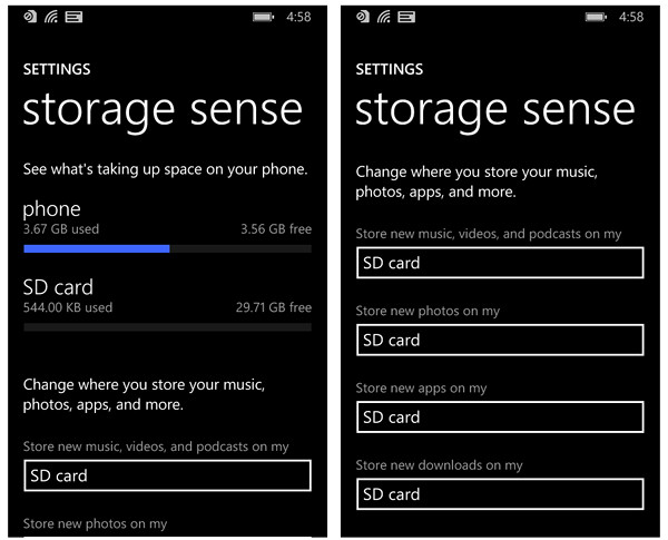 แอพพลิเคชั่น Storage Sense เครื่องมือในการย้ายไฟล์ และแอพพลิเคชั่นระหว่างหน่วยความจำภายใน กับการ์ด microSD และเป็นศูนย์รวมสำหรับการสั่งลบไฟล์ Temporary และถอนการติดตั้งแอพพลิเคชั่นด้วย