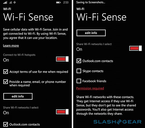 แอพพลิเคชั่น Wi-Fi Sense เปิดโอกาสให้ Windows Phone ทำการเชื่อมต่อกับ Wi-Fi Hotspot ที่มีการรับรองความปลอดภัยโดยอัตโนมัติเมื่อเข้าถึงพื้นที่ที่มีสัญญาณ Wi-Fi ครอบคลุม เพื่อลดการใช้ข้อมูลผ่านเครือข่ายโทรศัพท์มือถือ (3G/4G)